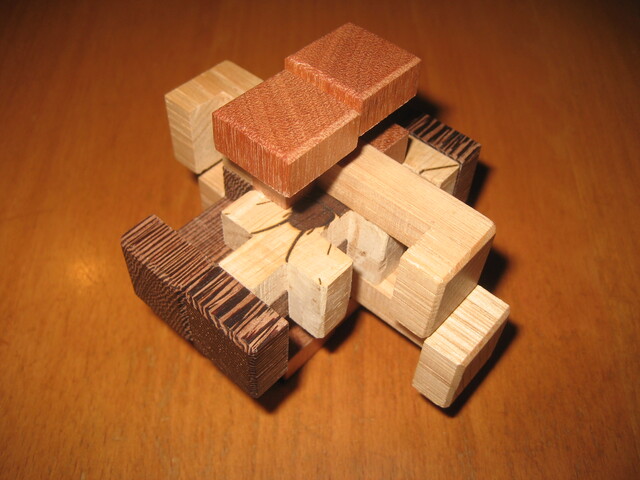 From Stephan's Camelride and also Alfons' 12 Bastards it inherits this 12 piece burr outer shape with additional pieces inside. From Save the Gorilla it inherits the gorilla figure (with a small modification) sitting staticly in the puzzlei until it is removed. From the Devil's Pets puzzles the pet shape of course, and also from Camelride the agility of this piece, moving through the puzzle during the solution. Like in Dirty Dozen it is also pushed with other pieces. The puzzle solves nicely and removing the first piece is quite difficult for only 19 moves. Among those moves are some typical moves for such a 12 piece burr, where the pieces heavily interlock while protruding from the puzzle, and some back and forth move sequences. The most interesting feat is what the pet piece does: This animal seems to have some free energy and is moving a lot during the solution, already four moves until the first piece comes out. In these moves, the pet piece is always pushed by others to move. When it comes to the third pet move, you better tilt the puzzle into the right orientation and carefully align the animal, or it will put its claws into the ground to resist. After the first piece has been removed, there are also moves where the pets moves on its own, unlocking more moves of other pieces. When you have removed most of the burr pieces, you will also be able to remove the pet and then also its master. The devil piece is securely locked into place until this moment and won't budge. Overall, this puzzle has some complex move sequences and as the puzzle is very well made and has perfect alignment, they are not obvious to find. With its level 19 and the move sequences for complete disassembly it is not too difficult to solve for an expert, but a nice little challenge, especially if you have some training on this topic like I did. It is a nice addition to the group with some interesting concepts! |
