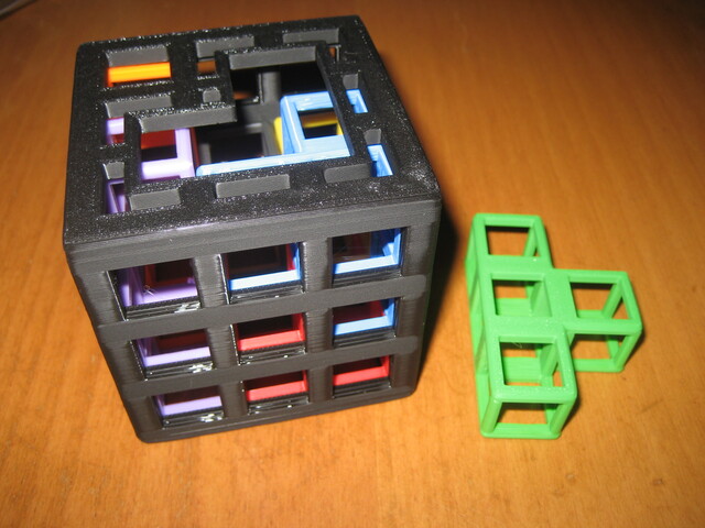 The frame can telescope 1 unit. Goal: Pack all pieces into the frame in a cube shape.