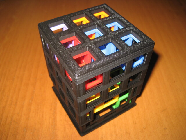 The frame can telescope 1 unit. Goal: Pack all pieces into the frame in a cube shape.