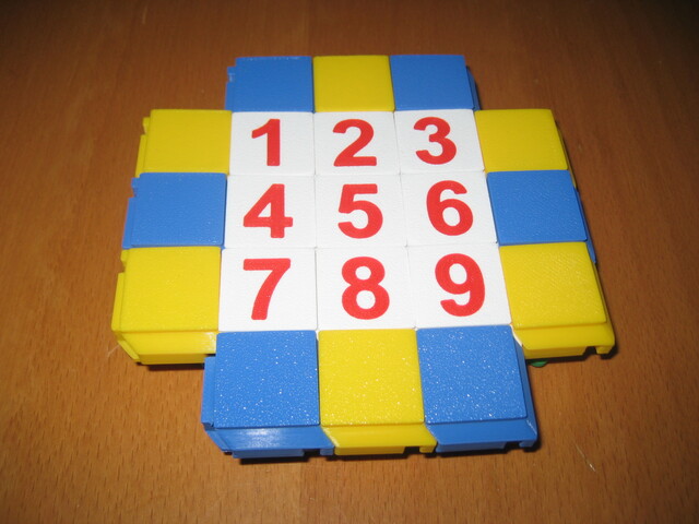 - Version of Bram Cohen's Enigmatic Shapeshifter puzzle, but with a chain on the yellow/blue pieces on the back instead of a complicated mechanism, enforcing that the coloured pieces always surround the white pieces